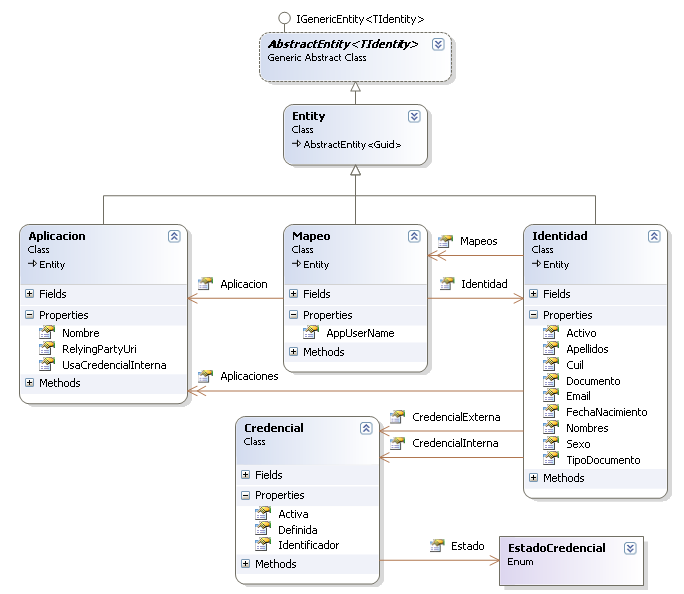 Three entities, some properties here and there, a class (Credencial) that is not an entity, an enum, some relations and one bidirectional relation (Identidad<->Mapeo).